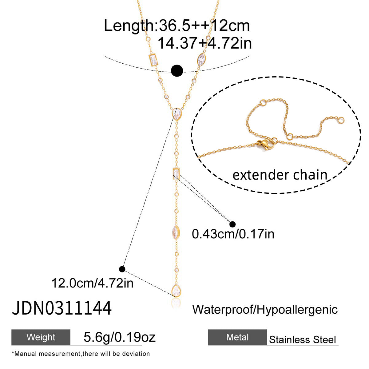 Titanium steel jewelry, anti-allergy, water-resistant, anti-fading. Elevate your style with this stunning white geometric zircon Y-necklace. Featuring a sleek geometric design with sparkling white cubic zirconia, it catches light beautifully for a glamorous look. Made of high-quality titanium steel, it’s hypoallergenic, fade-resistant and comfortable for all-day wear. The trendy Y-drop shape flatters any neckline, perfect for daily, parties, dates and gifts. A must-have elegant piece to enhance your outfit!